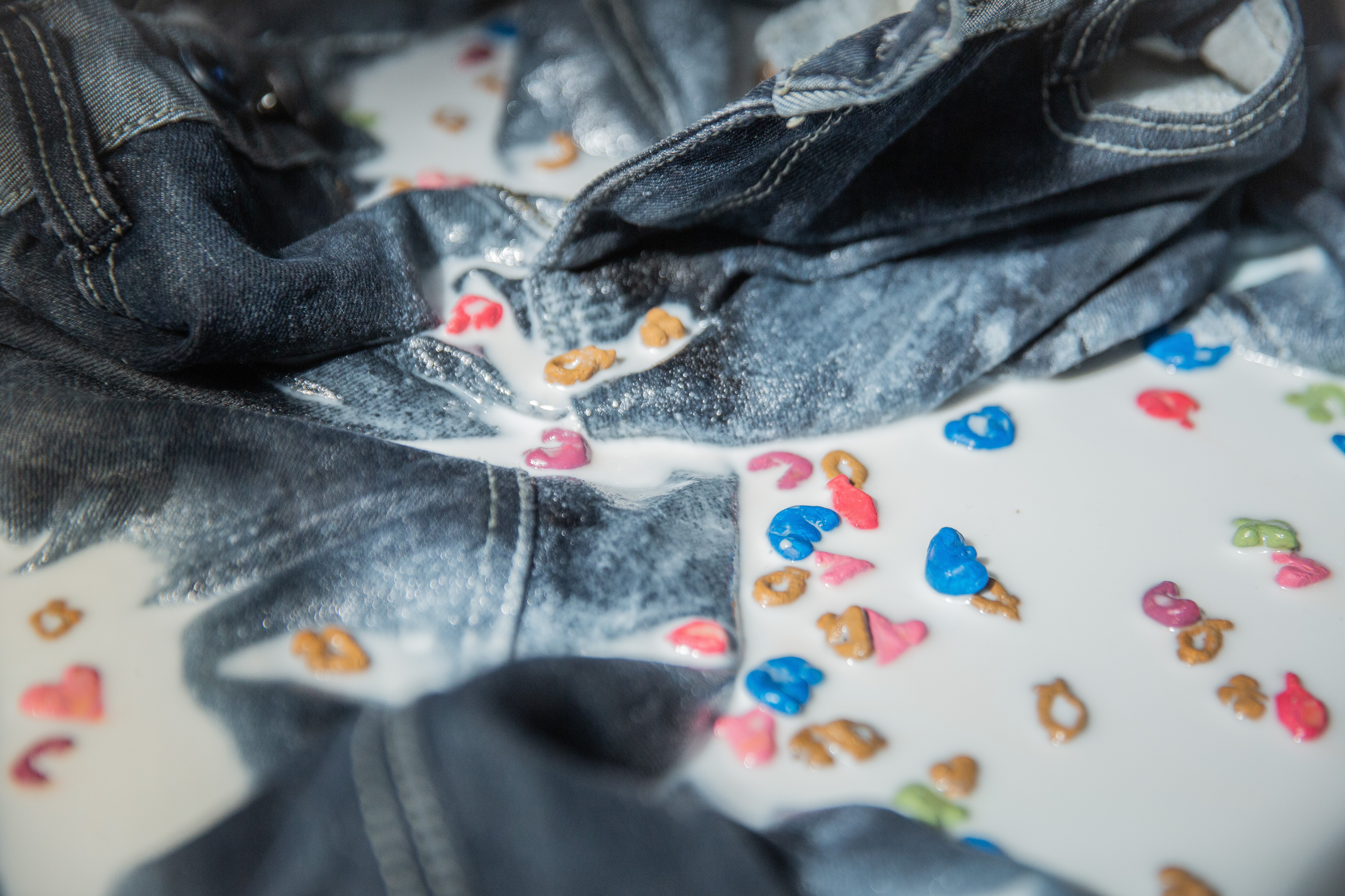 A pair of worn jeans containing the replica of spilt Fruit Loop cereal forming the Monoceros constellation. (A discreet joy, lost) (An absence that found filling). 2021 Jeans, polyurethane resin, white resin pigment, air-dry clay and acrylic paint. Detail image.