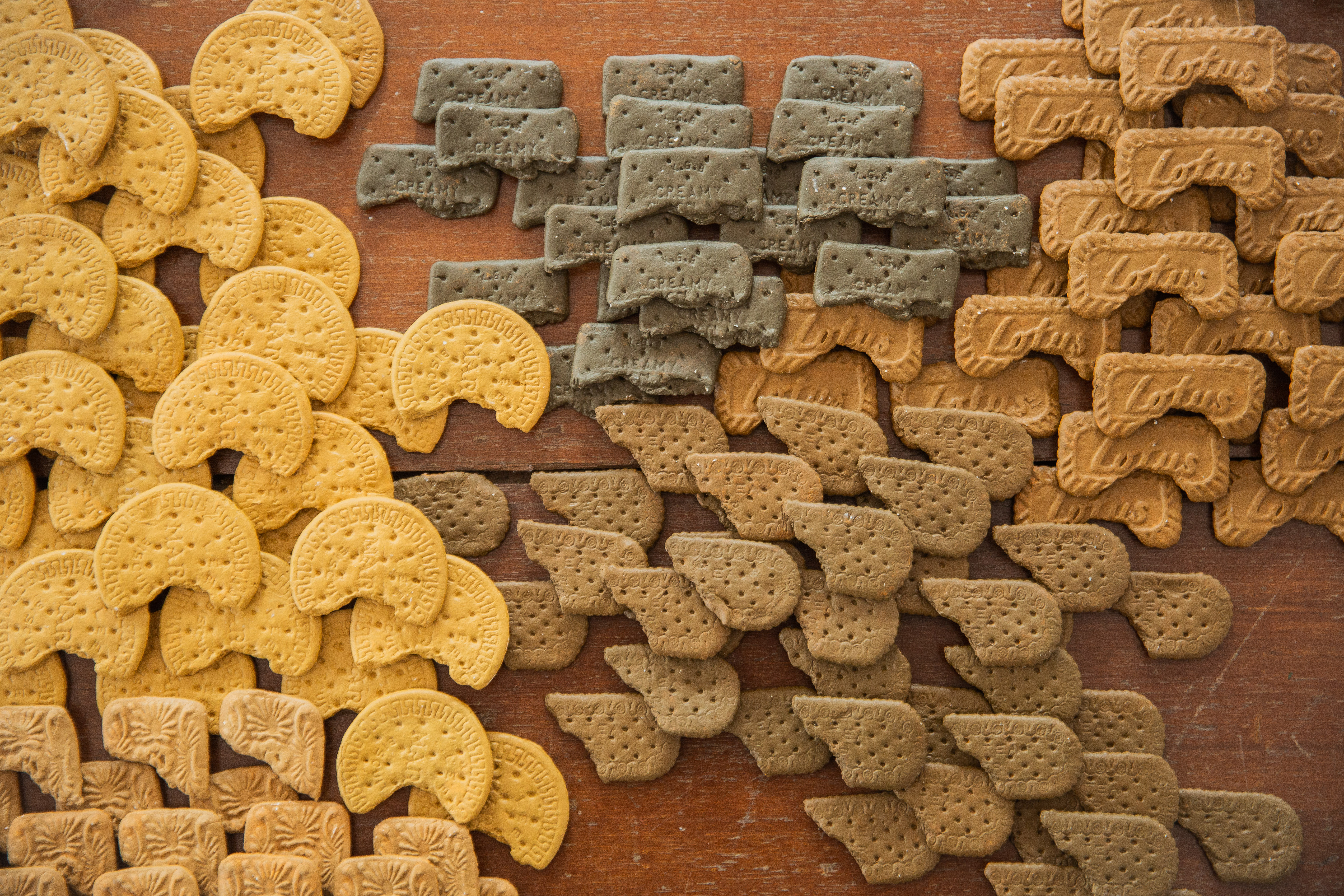 An orderly, yet fluid, arrangement of single bitten biscuits. (Manufacturing intimacies; a fallacy) (A ritual of absence). 2021. Air-dry clay and acrylic paint. Detail image.