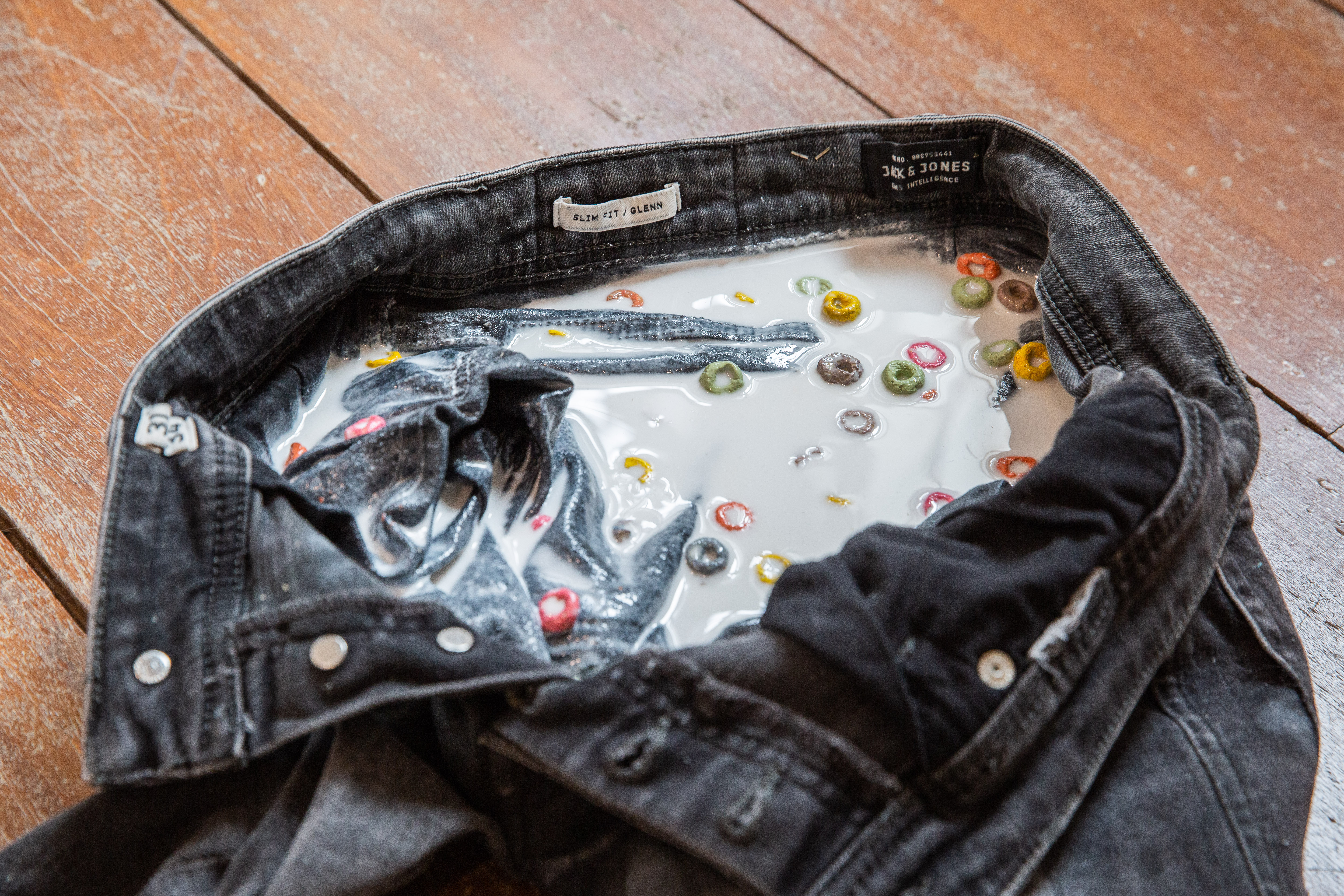 A pair of worn jeans containing the replica of spilt Fruit Loop cereal forming the Monoceros constellation. (A discreet joy, lost) (An absence that found filling). 2021 Jeans, polyurethane resin, white resin pigment, air-dry clay and acrylic paint.